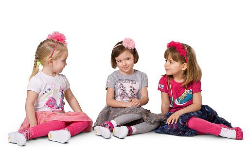 W kolekcji dziewczęcej dominuje tkanina dresowa. Dużo szarości i granatów, które zostały delikatnie przełamane romantycznym różem.